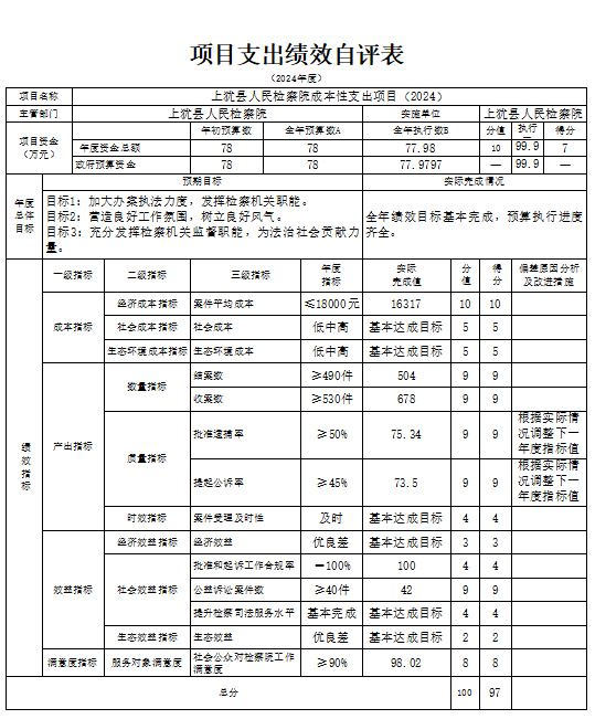 组织对1个项目开展了部门评价,分别为:上犹县人民检察院成本性支出项目(2024)。涉及一般公共预算支出78万元,政府性基金预算支出0万元,国有资本预算支出0万元。从评价情况看,预算内容与项目内容匹配,预算额度测算按标准编制,资金到位率100%。资金拨付手续完整,符合预算和国库管理有关规定;项目资金使用符合国家财经法规和财务管理制度以及有关资金管理办法的规定,不存在存在截留、挤占、挪用、虚列支出等严重违规情况,也不存在截留、挤占等情况。
