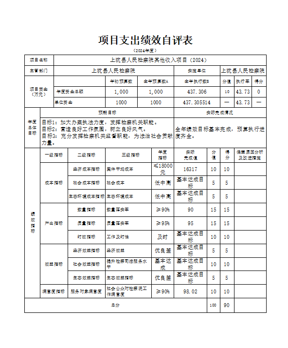 本院将按照相关文件要求对项目支出绩效自评表予以公开,另有2个项目涉密不予公开。上犹县人民检察院成本性支出项目(2024)”、“上犹县人民检察院其他收入项目(2024)”项目支出绩效自评结果如下: